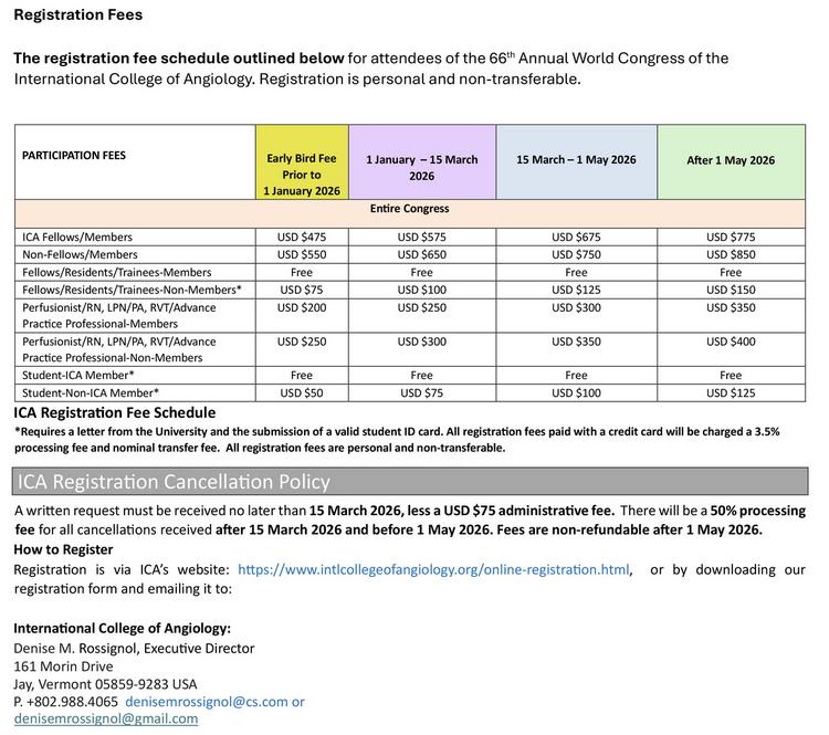 The registration fee schedule is outlined below for attendees of the 67th Annual World Congress of the International College of Angiology.